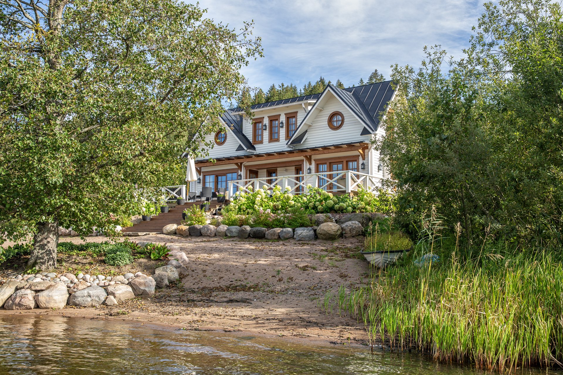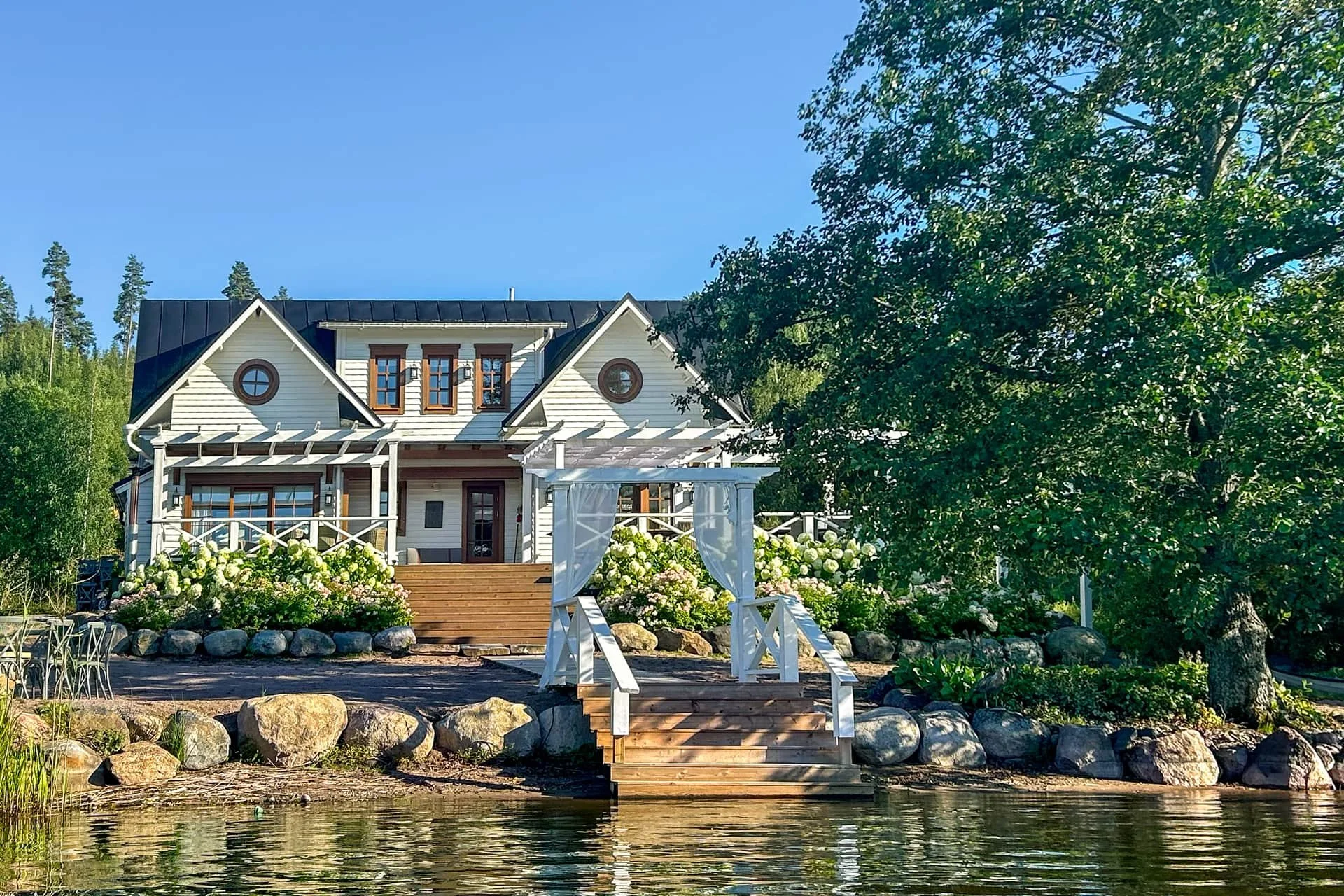 Villa Stenberg is a lakeside retreat located just a 45-minute drive from Helsinki, and is located in an idyllic location on the shore of Lake Lohjanjärvi. The beautiful interiors and impressive exterior spaces were designed by the owner of the place, interior designer Hanna Chaker, whose style can be seen in every detail. Villa Stenberg has become one of the most prestigious venues in Southern Finland and it has been named the best Airbnb wedding venue in Europe (Trip 101).
